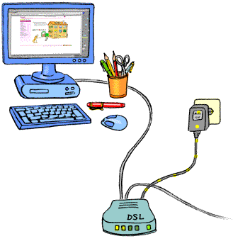 Der DSL-Router dient dazu, einen oder mehrere Computer mit dem Internet zu verbinden. Er kann auch das Digital-Fernsehen ins Haus bringen oder die Telefonleitung übernehmen (siehe Hinweise zu diesem Mehrfachsystem). Der Router ist mit einem Kabel mit der Telefonbuchse verbunden und kommuniziert mit anderen Computern entweder via Kabel oder Mikrowellen. Im letzteren Fall spricht man von WLAN (Wireless Local Area Network = drahtloses lokales Netzwerk) oder einfacher auch WiFi (Wireless Fidelity).